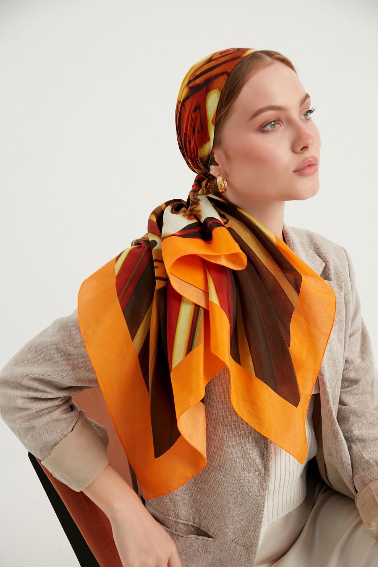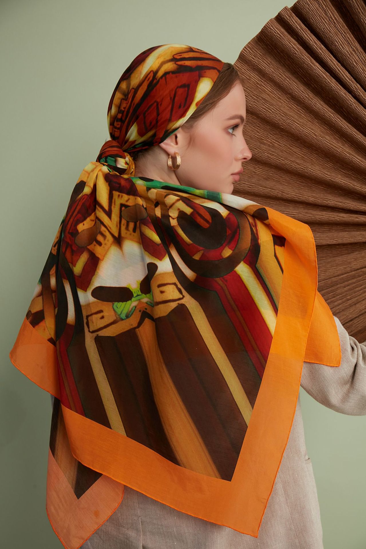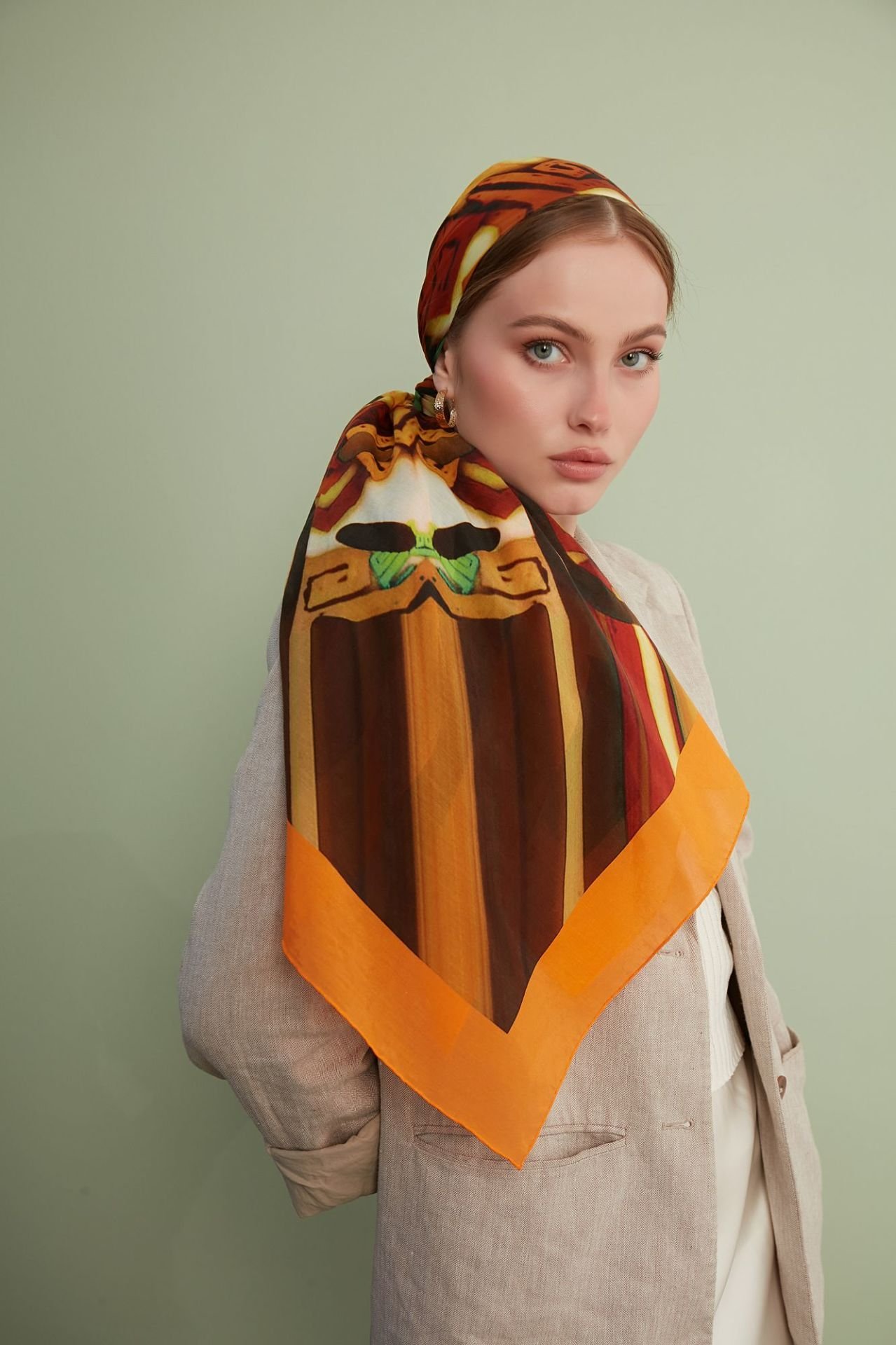 Pamuk İpek Antik Desenli Pareo Şal Kahve turuncu altın