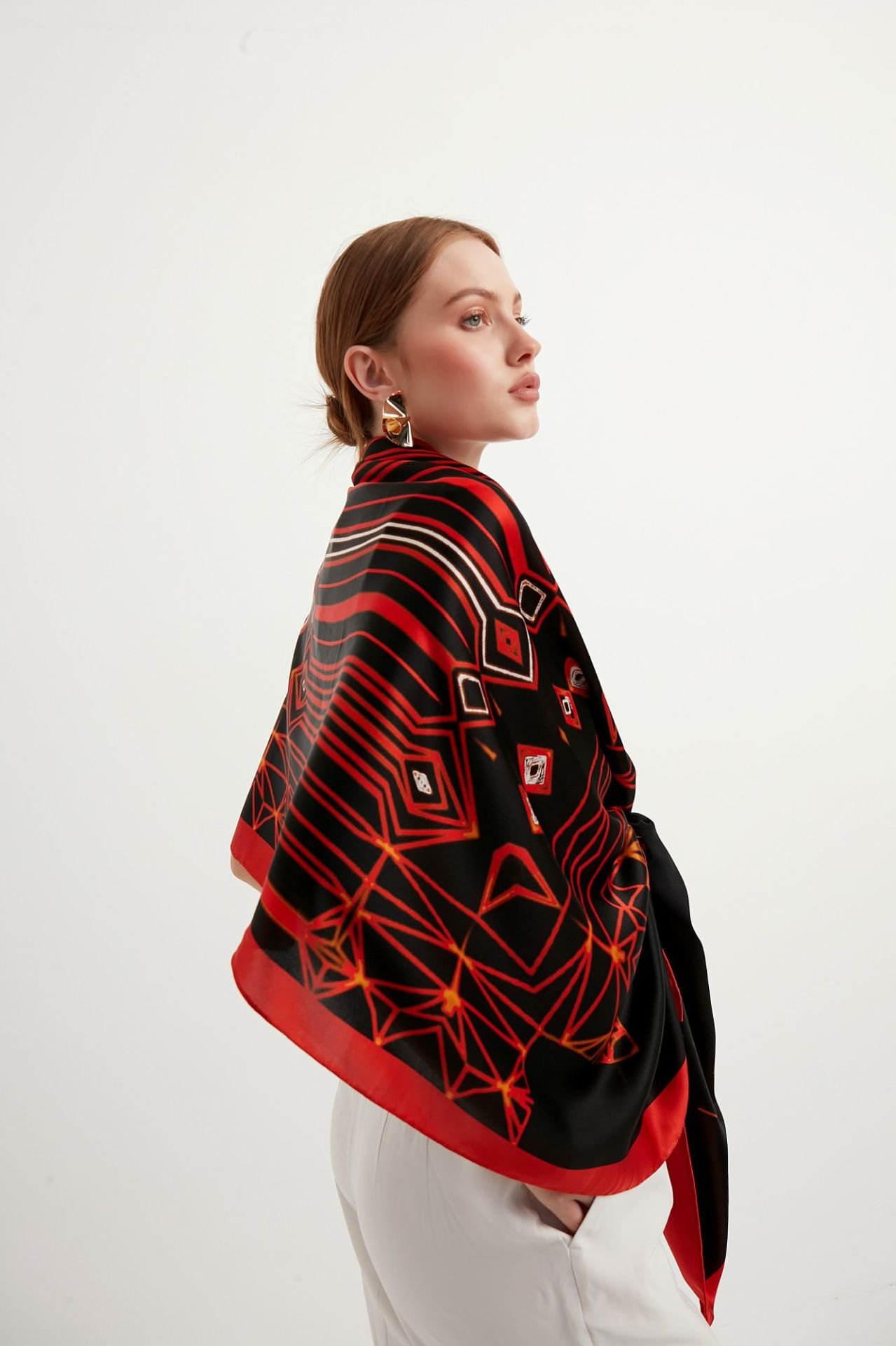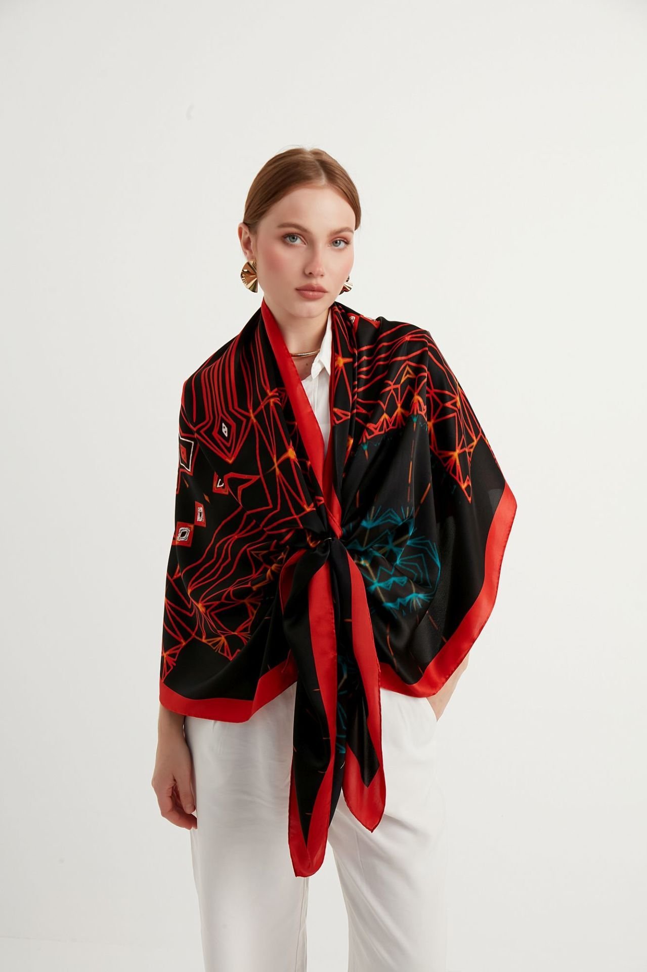 Kültürel zarafet ve sanatsal dokunuşlarla bezeli aksesuarlar arayanlar için mükemmel bir tercih olan doğal ipek kumaştan üretilmiş şalımız dört mevsim kullanabileceğiniz kırmızı, siyah ve turkuaz gibi asil renklerle göz doldururken, yalın antik desenleri ile de zamansız bir şıklık sunuyor.