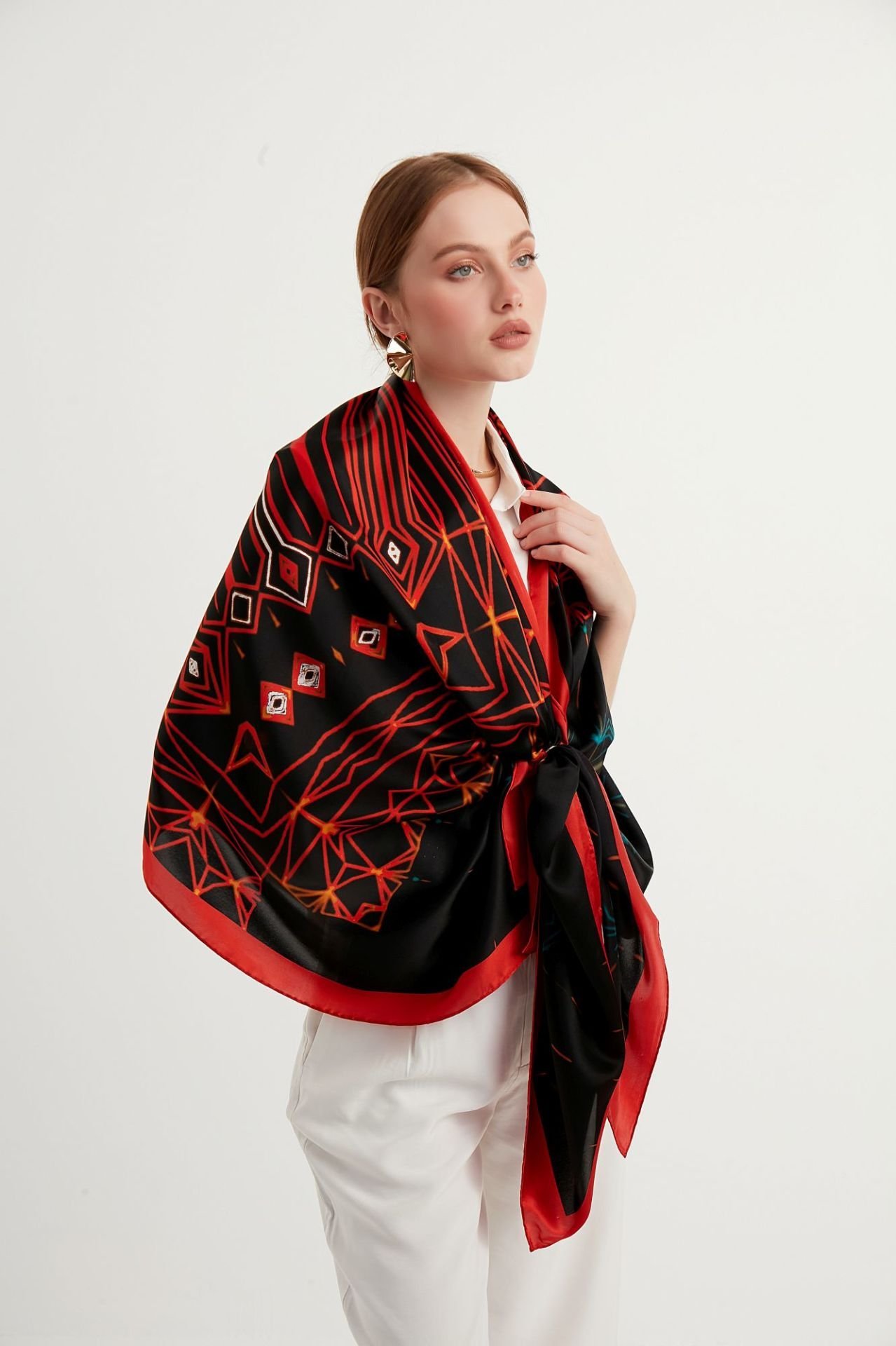 AKM Sanat Koleksiyonu Kırmızı Siyah Krep İpek Şal