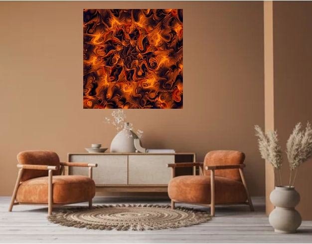 Fraktal formüllerle tasarlanan bir çağdaş sanat ürünü olan Alev isimli soyut eser ateşin sıcaklığını hissettiren canlı renkleri, alevlerin dansını yansıtan figürler ve her bir noktasında makrokozmosu gizleyen detayları ile içinizi ısıtmaya adaydır.