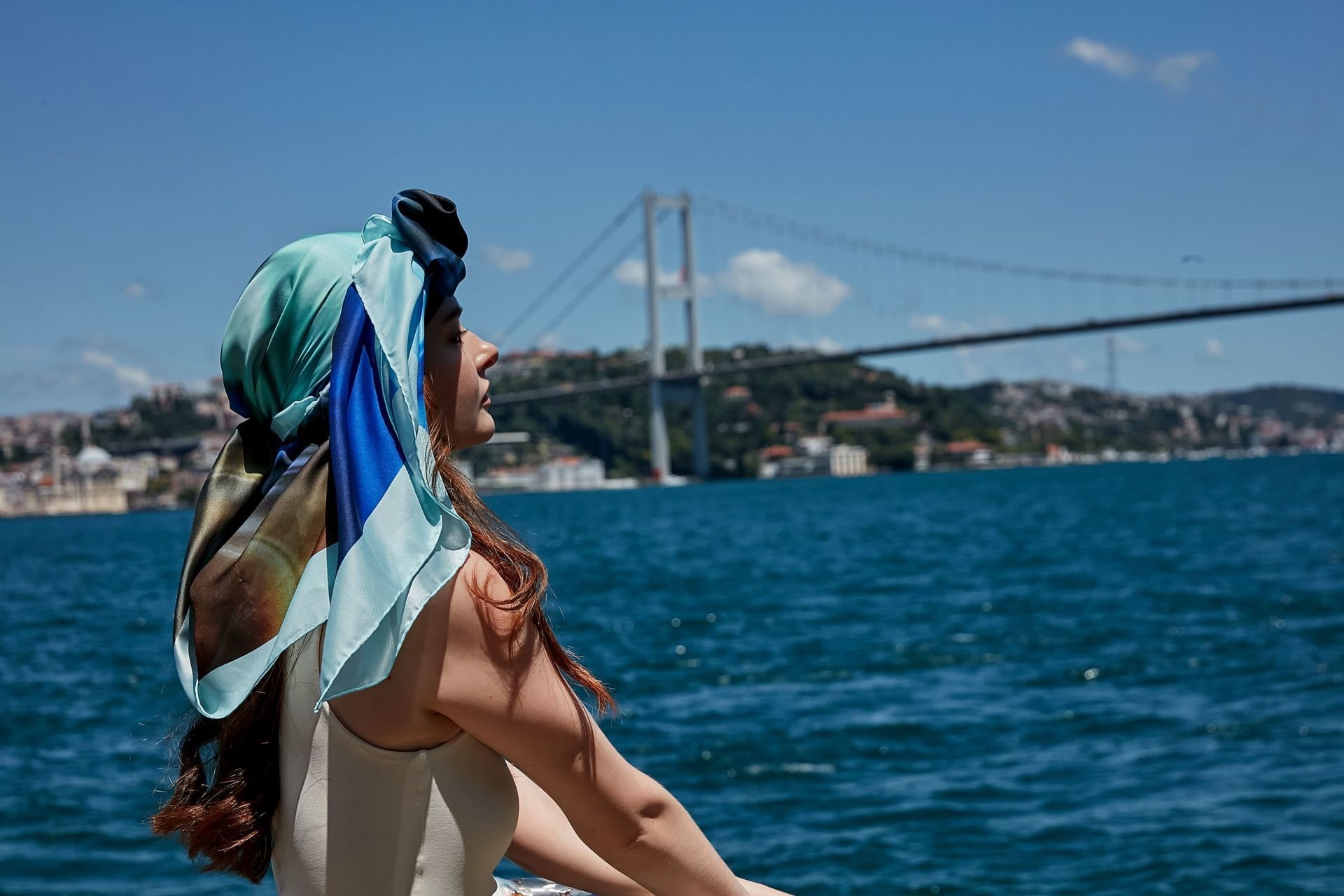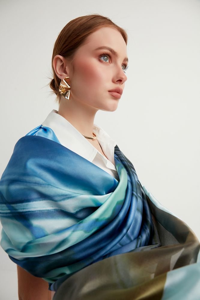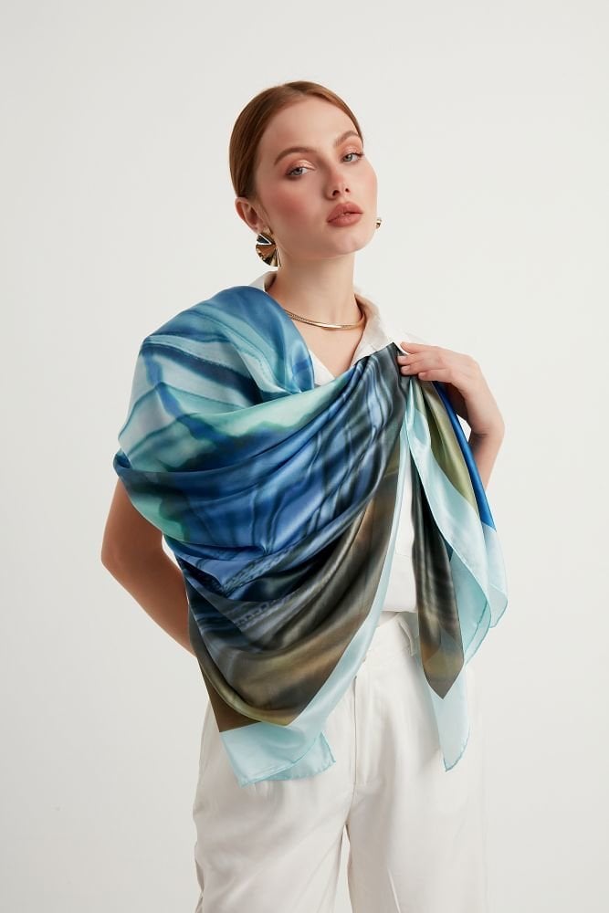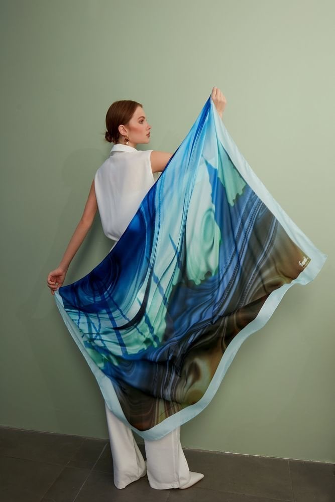 Bu eşsiz tasarım şal, İstanbul'un eşsiz güzelliklerini turkuaz, mavi ve yeşilin huzur veren tonlarında yeniden yorumluyor. İstanbul'un ikonik Galata Kulesi ve büyüleyici siluetleri, boğazın turkuaz suları ve gökyüzünün sonsuz maviliği ile birleşerek, çağdaş esintiler ve fraktal desenlerle harmanlanmış giyilebilir bir sanat eserine dönüşüyor.