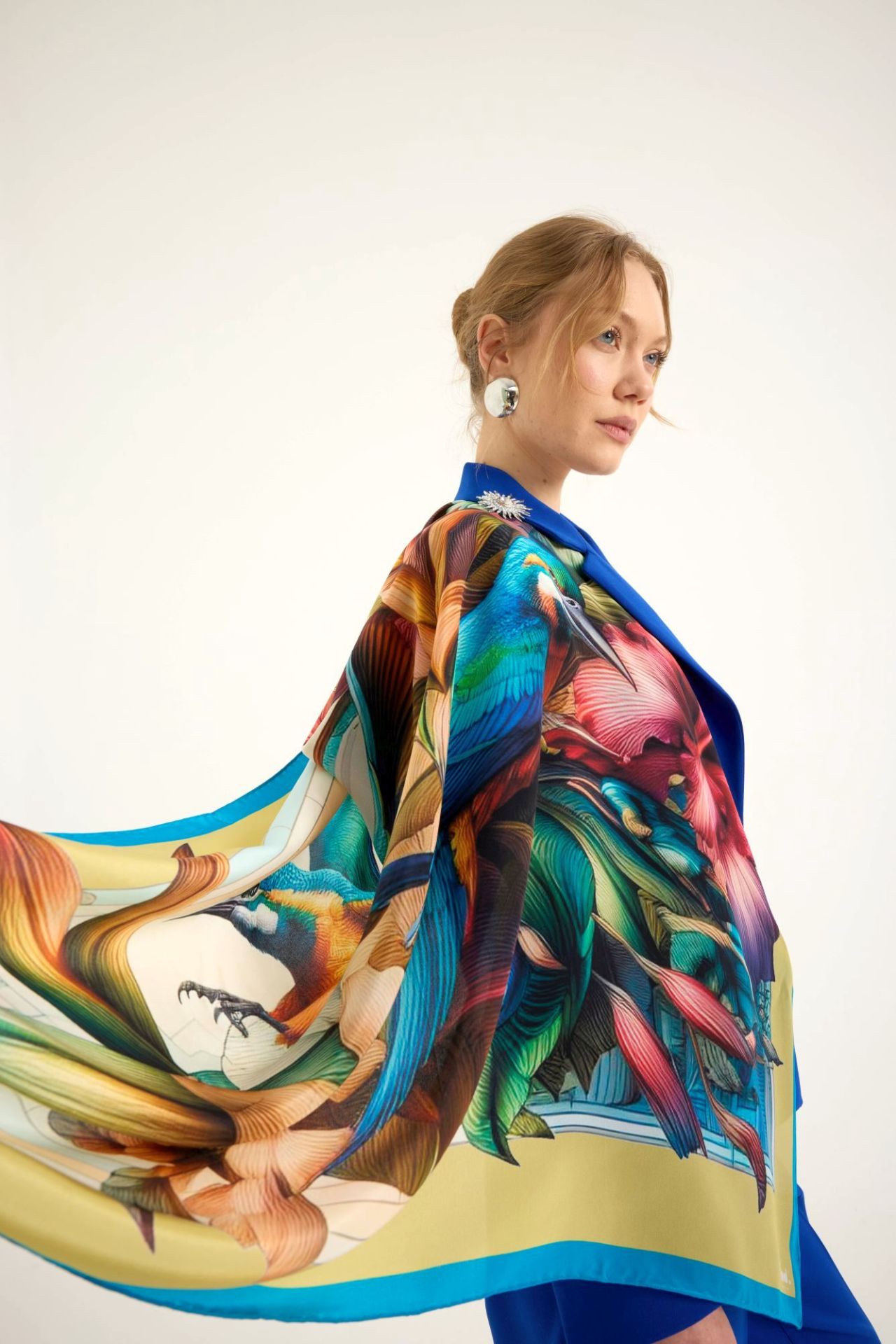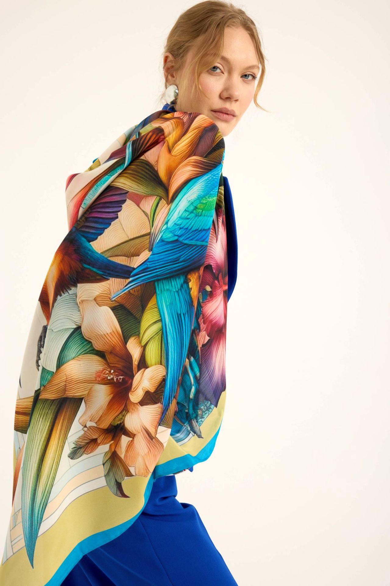 2025 ilkbahar yaz sezonunda, doğanın en zarif ve renkli yönlerini yansıtan "Kuş ve Çiçek" temalı eşsiz Ekinoks Krep İpek Şal koleksiyonunun bir parçasıdır.