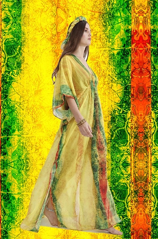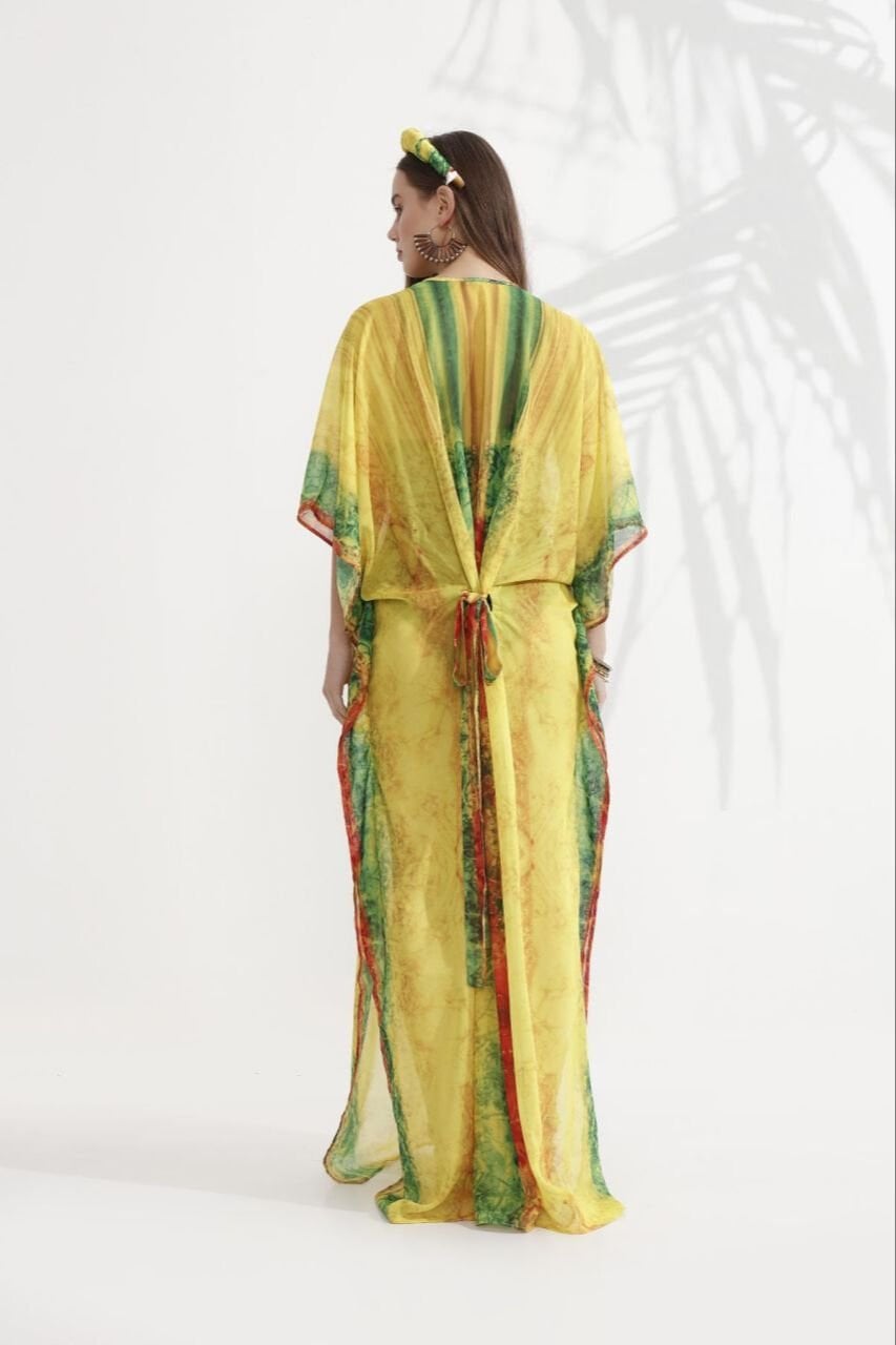 Antik Desenli Altın sarısı , Zümrüt yeşil kuşaklı Şifon Kimono Plaj Elbisesi