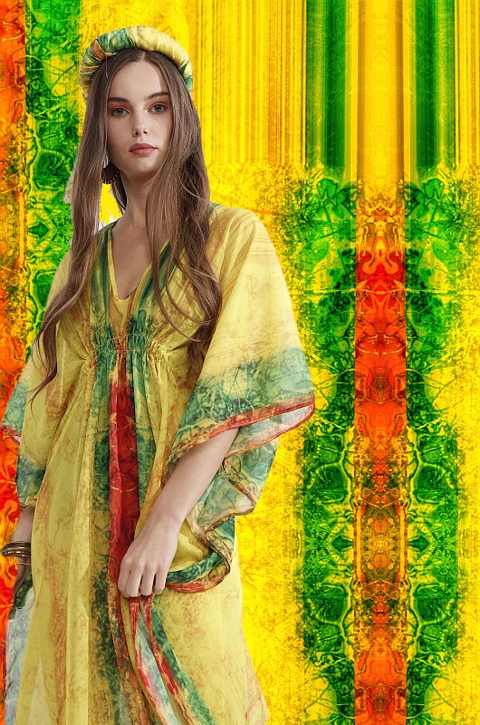 Fraktal formüllerle tasarlanan sanat eseri bir tablo görünümündeki TheFAD.co Kimono, gün boyunca güzel anlarınızda size plaj ve gece elbisesi olarak eşlik etmeye hazırdır.