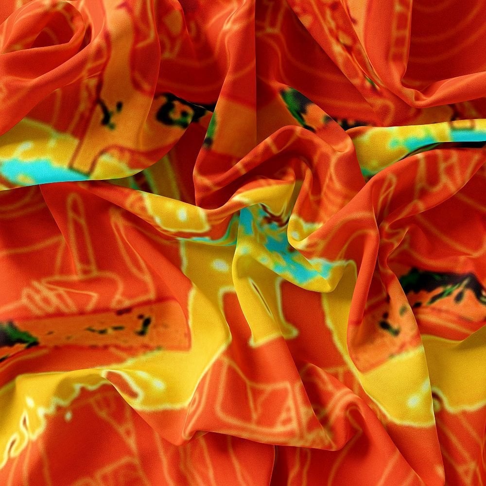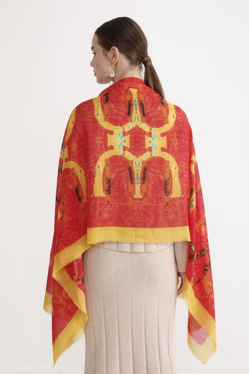 Pamuk İpek Antik Desenli Pareo Şal Ateş kırmızı, turuncu ,altın sarısı 70X200cm