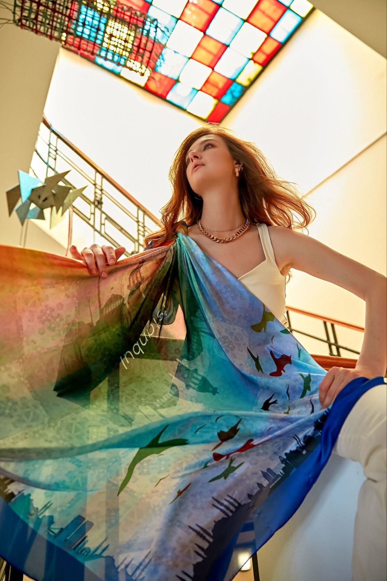 Tasarım: İstanbul'un tarihi yapılarının ve siluetlerinin yanı sıra, boğaz üzerinde süzülen martıların zarafeti, fraktal desenlerle bir araya getirilerek sanatsal bir ifadeye dönüştürülmüştür. Bu şal, giyen kişiye sadece ambiyans değil, aynı zamanda derin bir kültürel dokunuş sunar. Şal sağ alt köşesinde markanın logosonu taşır.