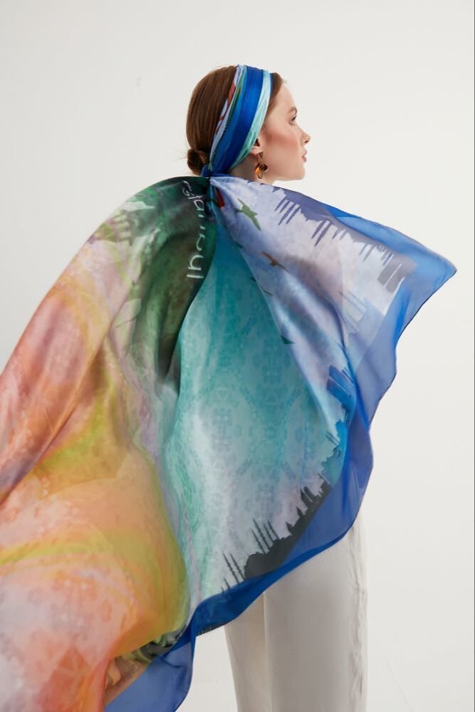 Renkler: Göz alıcı mavi ve turkuaz tonları, İstanbul boğazının benzersiz güzelliğini yansıtırken, altın sarısı detaylar şehrin tarihine ve zarafetine saygı duruşunda bulunur. Bu renklerin muhteşem uyumu, şalınıza sofistike bir ışıltı katar.