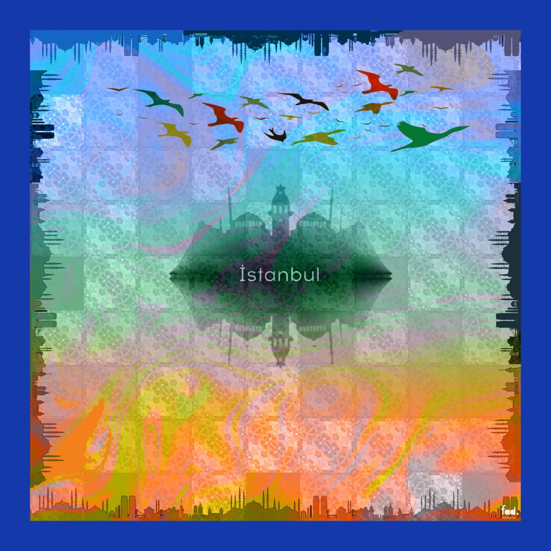 Bu şal, İstanbul'un tarihini, doğal güzelliğini ve kültürel zenginliğini giyilebilir sanata dönüştüren bir tasarım eseridir. Mavi, turkuaz ve altın sarısı renk tonları ile canlandırılan İstanbul'un tarihi siluetleri ve mavi boğazının üzerinde uçan martılar, fraktal desenlerle birleştirilerek estetize edilmiş ve bu eşsiz tasarım ortaya çıkarılmıştır. Modern ve geleneksel unsurların zarif bir sentezi olan bu şal, şehrin ruhunu ve estetiğini her detayında size yansıtır.
