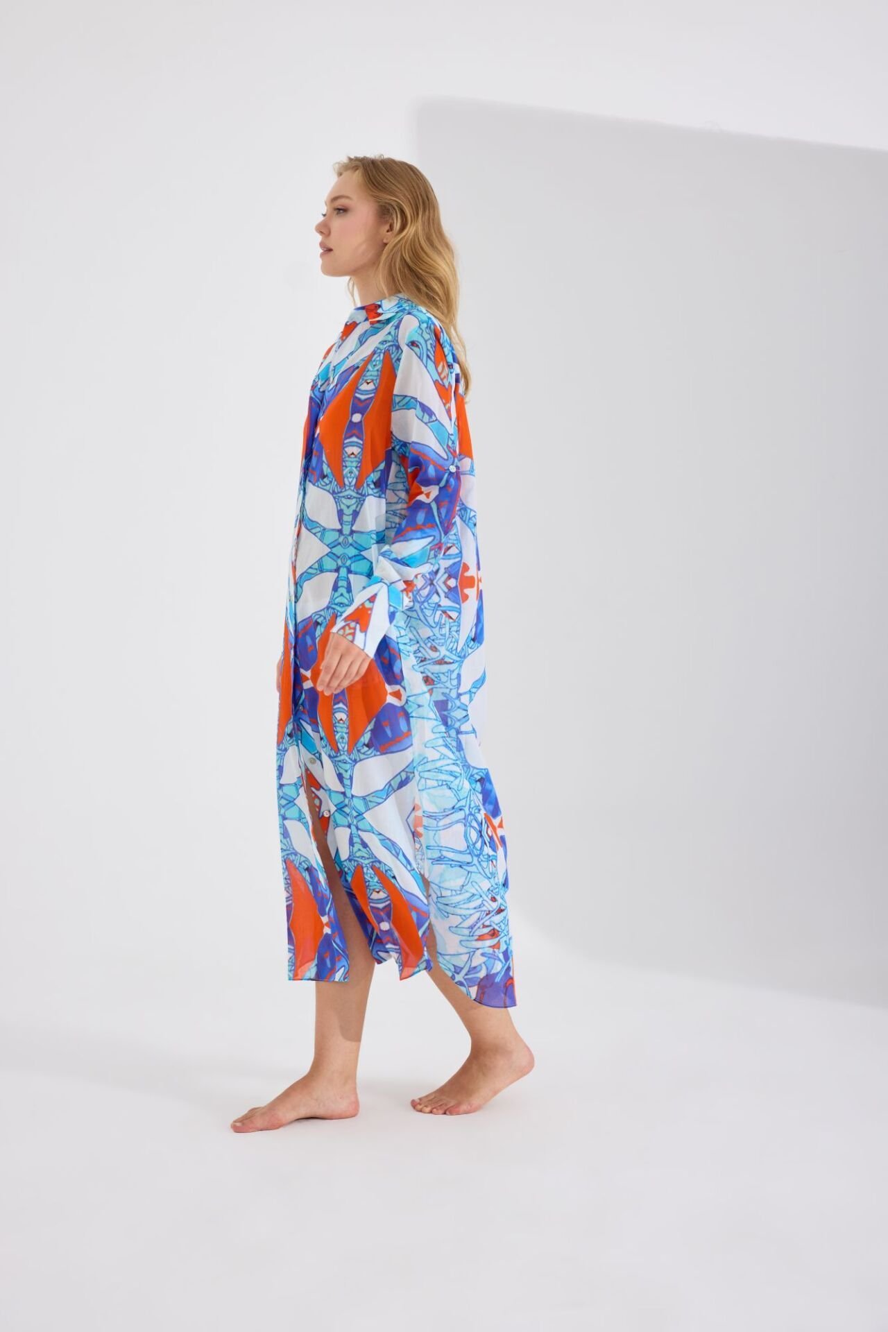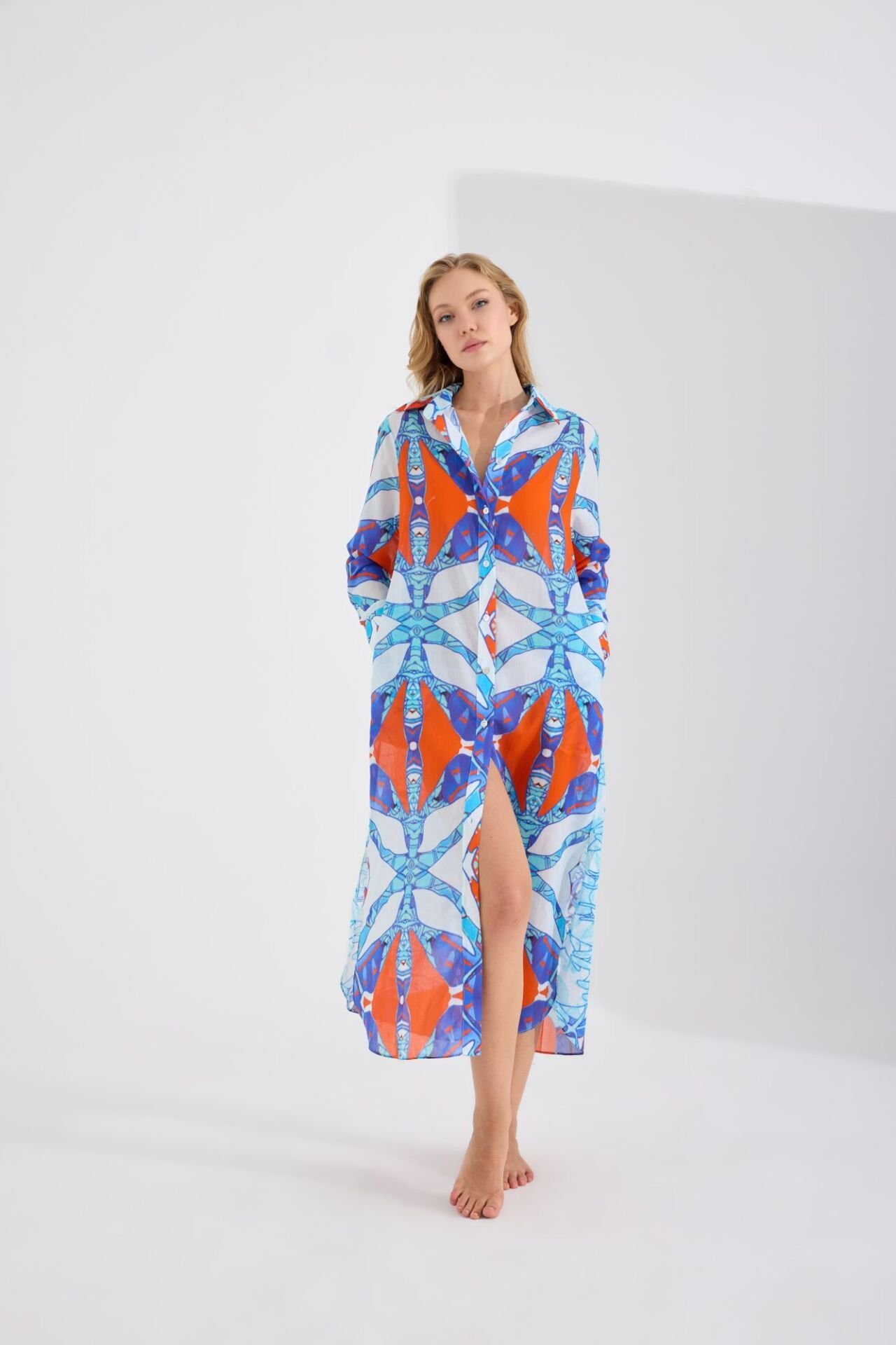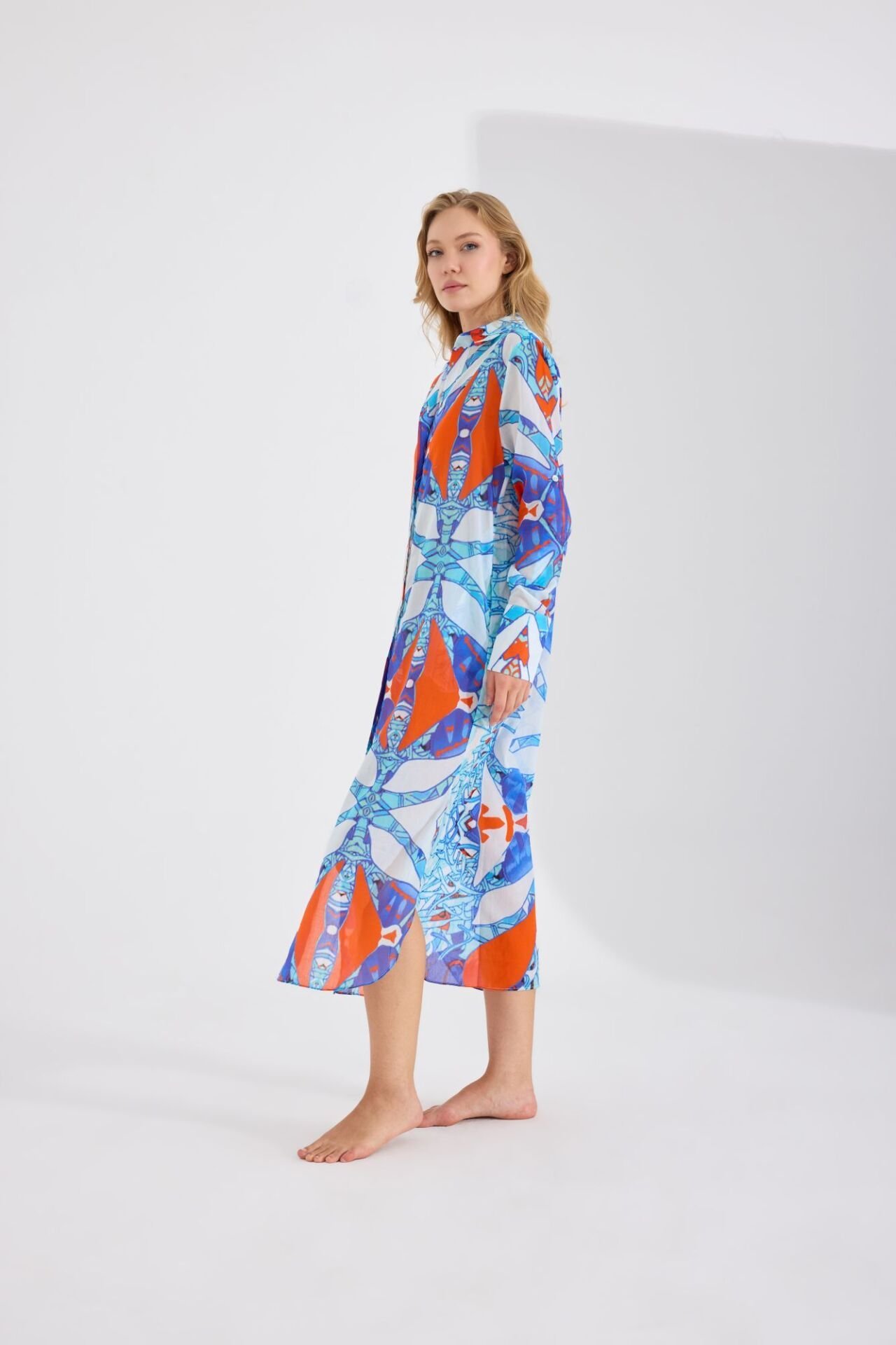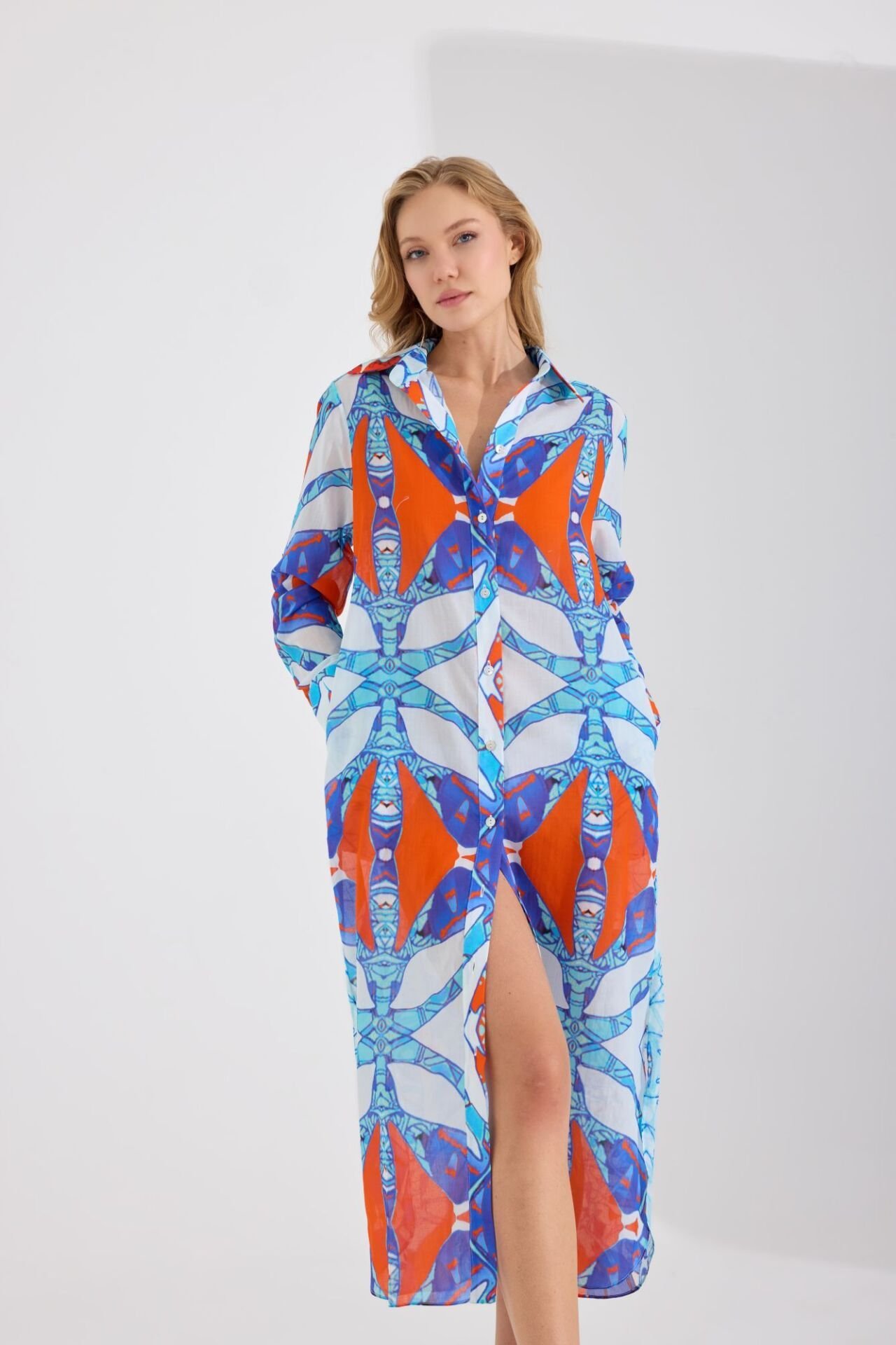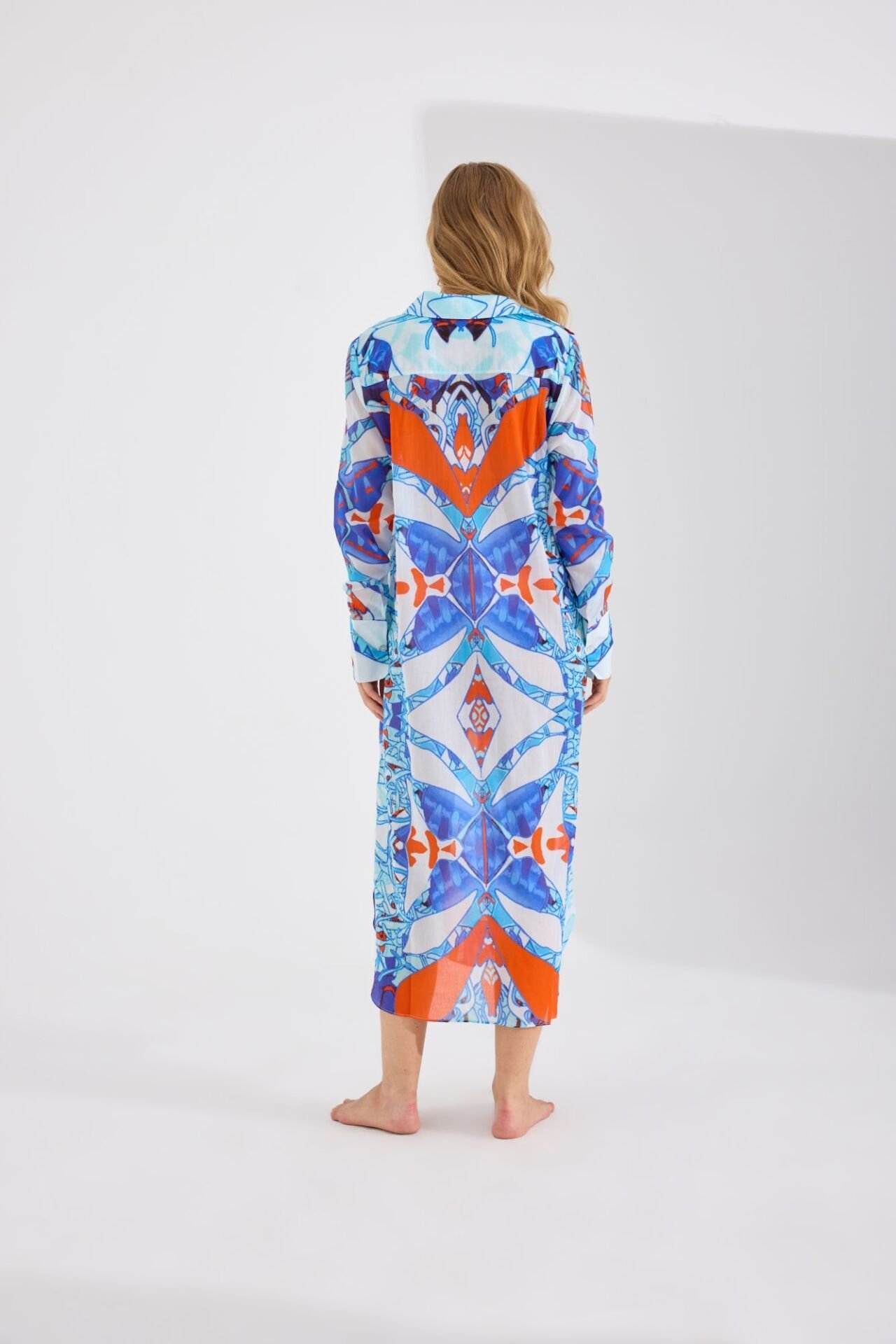 Ön ve arkası birbiri ile harmoni içinde farklı desenlerden oluşan rahatlık ve şıklığın mükemmel birleşimi olan Gömlek elbise özenle seçilmiş nefes alabilen, hafif ve size gün boyu konfor sağlayacak pamuk kumaş üzerine, Fraktal simetri ve altın oran prensipleriyle tasarlanmış motifler ve modernize sembollerle görsel bir ahenk yaratmaktadır. Sedef düğmeler ve manşetler tasarıma sofistike bir hava katmaktadır