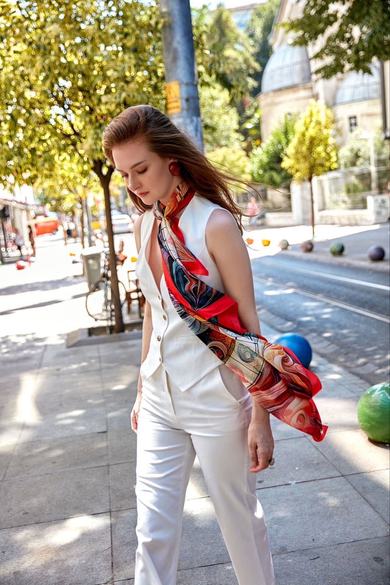 Zodyak Krep İpek Şal, özenle seçilmiş krep ipek kumaş üzerine çevreci zararlı olmayan Oeka-Tex sertifikalı boyalar kullanılarak, sanatsal bir hassasiyetle ve en ince detaylara kadar titizlikle dikkat edilerek sınırlı sayıda dijital olarak basılarak üretilmiştir. İpek krepin pürüzsüz dokusu, tasarıma ayrı bir asalet ve zarafet katmaktadır. Şalın kenarları emekçi kadınların maharetli ellerinde özenle kıvrılmıştır. Tasarımımız gardırobunuzda gerek Şal gerekse çantanızda heran kullanıma hazır özgün bir bandana olarak özel bir yere sahip olacaktır.